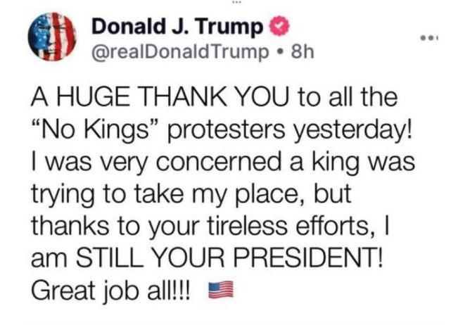 My favorite was some leftist crowing about the lack of counter protests. They don't get it.....77M of us counter protested by voting in November 2024 and we are getting exactly what we voted for and love every minute of it. We were home watching college football, taking hikes or spending time with our families. Why counter protest a bunch of old, white boomers prancing and dancing around in costumes? Soon enough they will be too old for even that and will be off to their eternal reward.